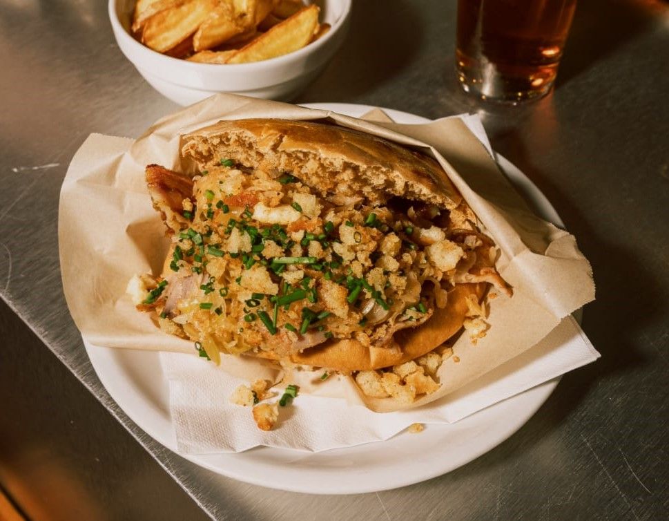 4 falafel in a Nan with lettuce, tomato, red onion, red sauerkraut, Harissa-based spicy sauce, yoghurt and garlic sauce.